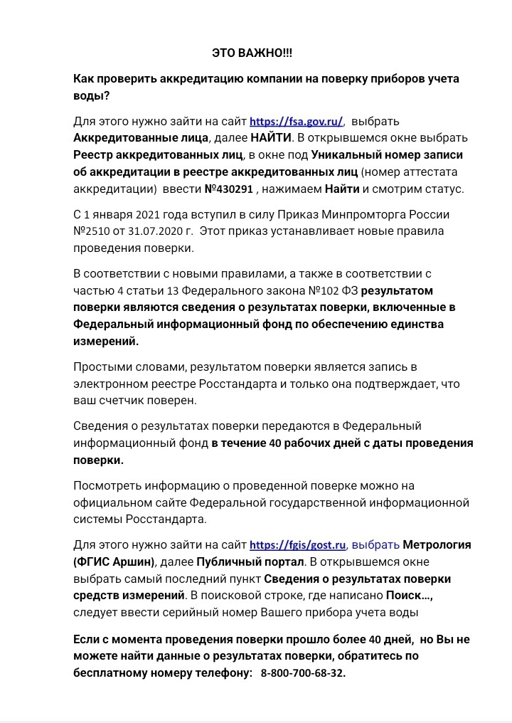 Производить ПОВЕРКУ счетчиков воды имеют право только юр. лица/индивидуальные предприниматели, являющиеся обладателями действующего Аттестата аккредитации в области единства измерений, выданного Федеральной службой по аккредитации. Поэтому, заказывая поверку, обязательно проверьте наличии данного документа. Так же наличие Аттестата аккредитации можно проверить на сайте Федеральной службы по аккредитации в реестре аккредитованных лиц http://fsa.gov.ru/